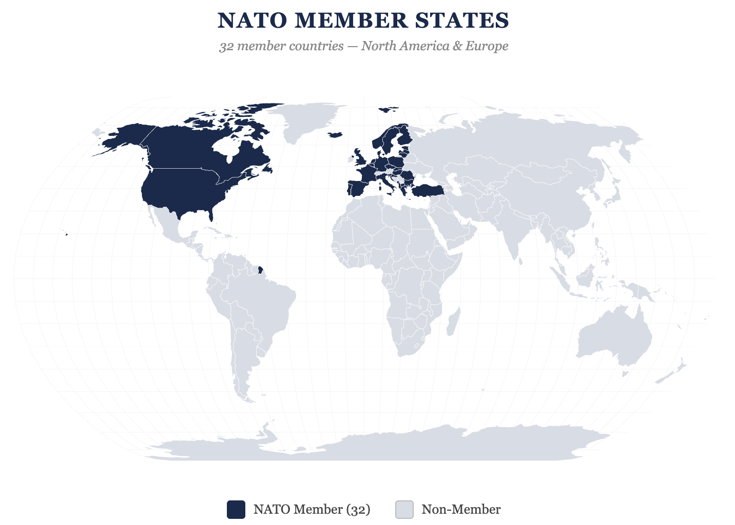 Today NATO has 32 member countries spanning North America and Europe, from the United States and Canada to tiny Montenegro and Iceland. They strive to keep the peace based on common values like democracy and freedom. Preferably with diplomacy, if necessary with military force.